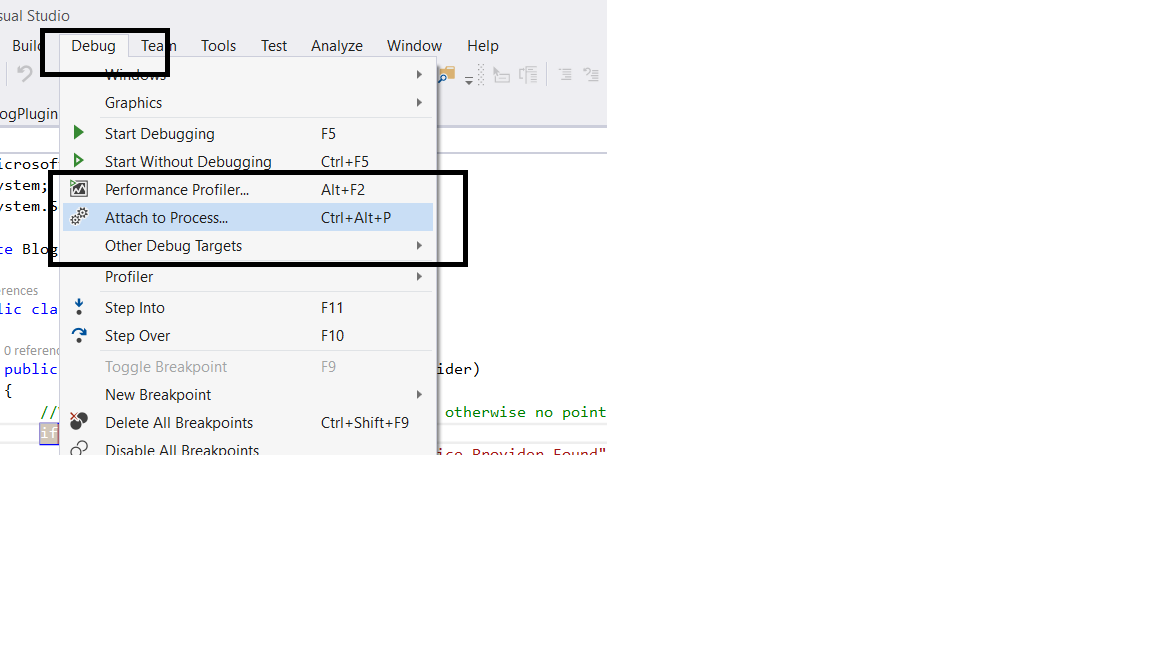 Now Open your Plugin Assembly in visual studio and go to Debug > Attach to Process