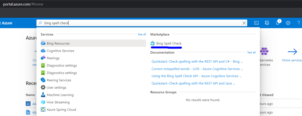 - Step 1 : Go to Portal.azure.com and Search Bing Spell Check and click Bing Spell Check to create new