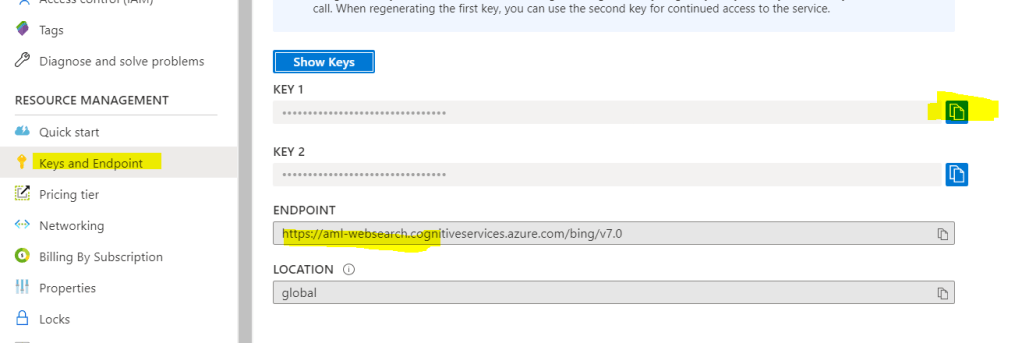 Copy the Endpoint and the key, you will need this two in application to call this Bing Web Search API.