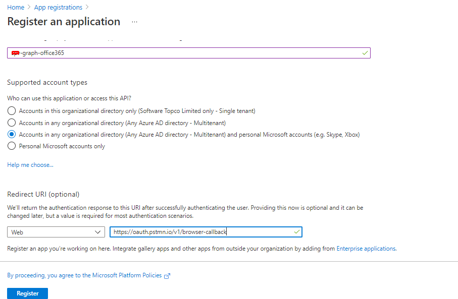 Provide Name, Account Type and Redirect URL (For POSTMAN put : https://oauth.pstmn.io/v1/browser-callback)