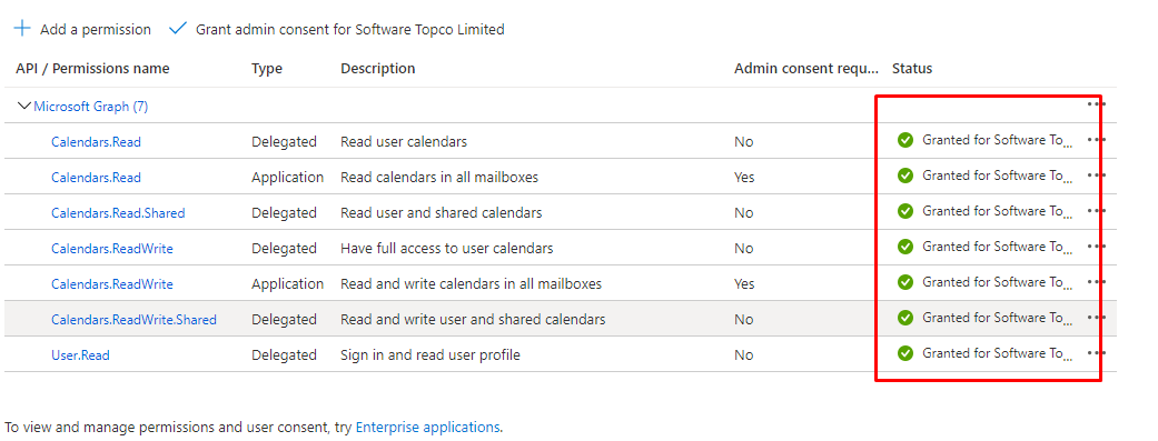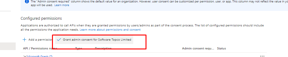 Click Ok and on main page click “Grand Admin Consent for {CompanyName}”