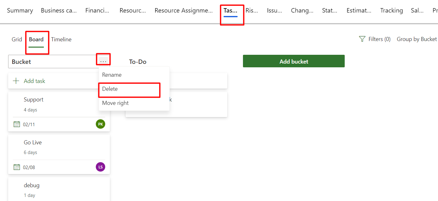 To Delete Bucket, Simple go to Task and visit Board tab and delete from here.