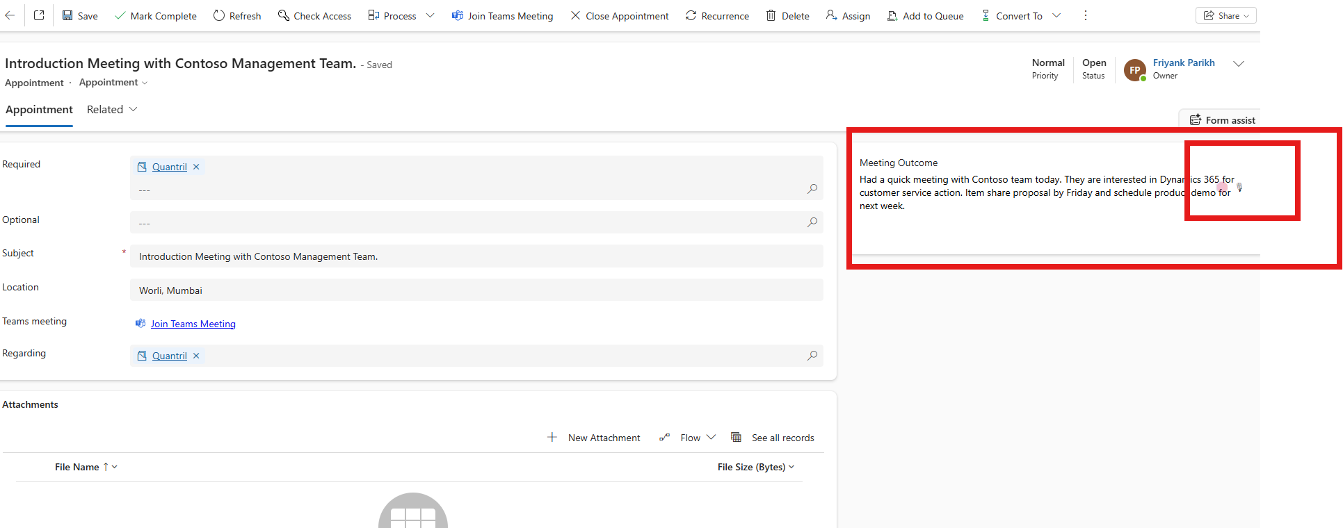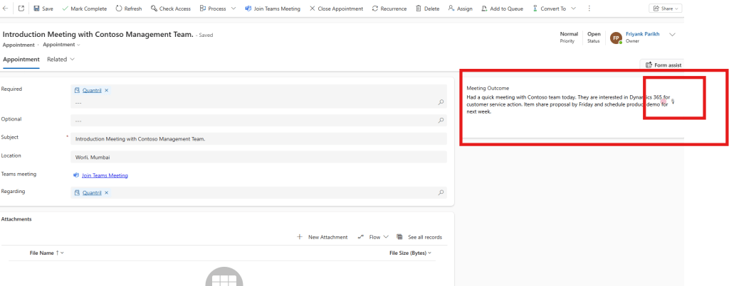 “Had a quick meeting with Contoso team. They are interested in Dynamics 365 for customer service. Action item: Share proposal by Friday.”